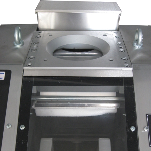 All the surfaces contacting the dough are made of stainless steel. It cuts the dough with its weight thanks to the vacuum generated by piston cylender movement.